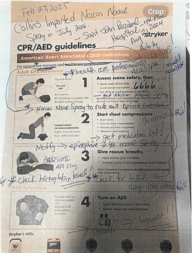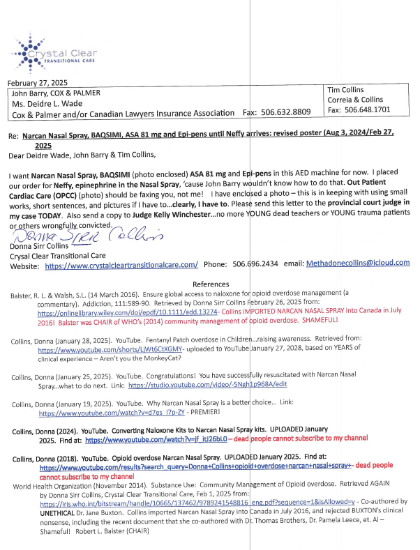 I want Narcan Nasal Spray, BAQSIMI (photo enclosed) ASA 81 mg and Epi-pens in this AED machine for now. I placed our order for Neffy, epinephrine in the Nasal Spray, 'cause John Barry wouldn't know how to do that. Out Patient Cardiac Care (OPCC) (photo) should be faxing you, not me! I have enclosed a photo- this is in keeping with using small works, short sentences, and pictures if I have to...clearly, I have to. Please send this letter to the provincial court judge in my case TODAY. Also send a copy to Judge Kelly Winchester...no more YOUNG dead teachers or YOUNG trauma patients or others wrongfully convicted.